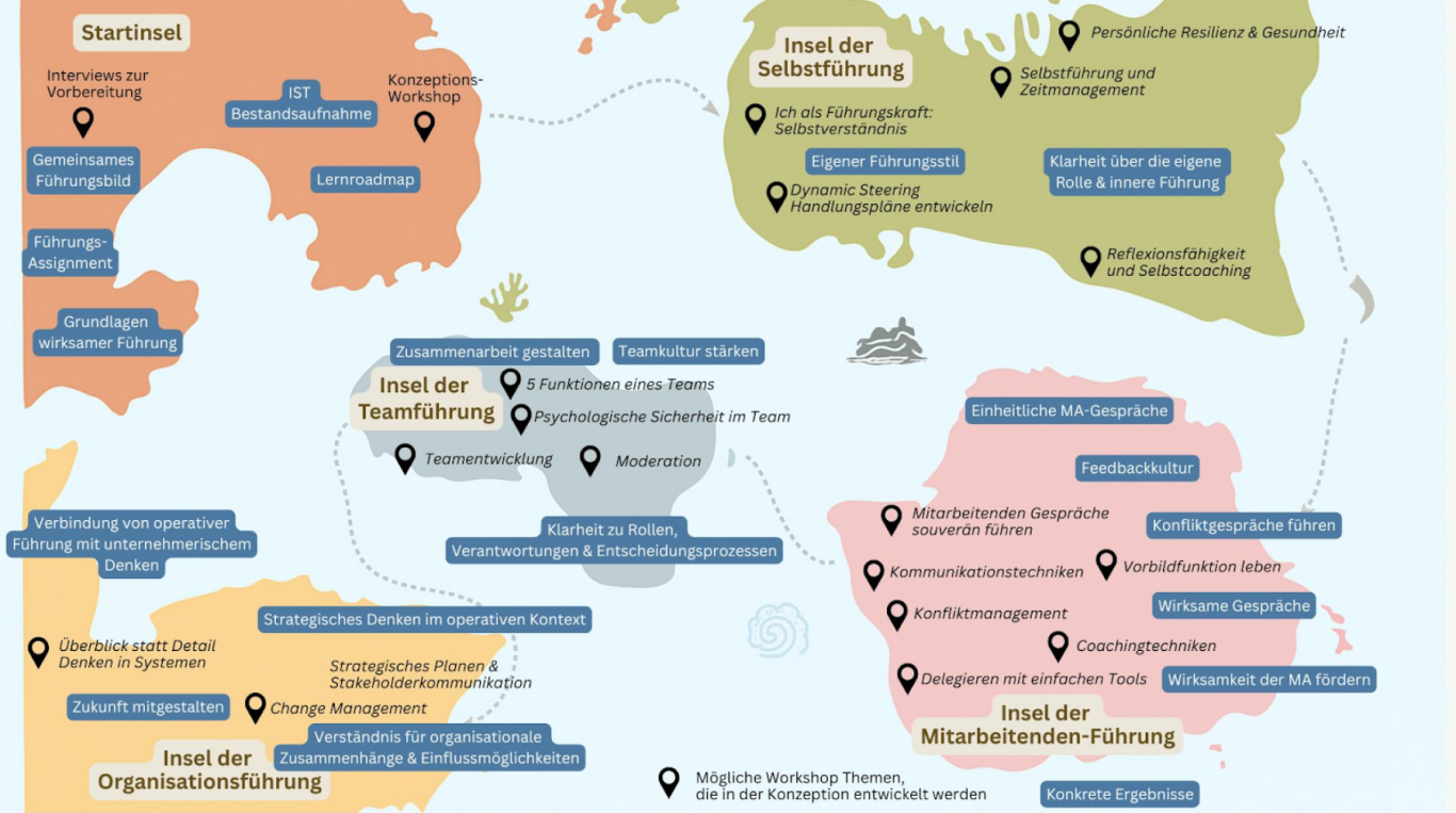 Das Besondere: Die Inhalte der einzelnen Inseln werden nicht einfach vermittelt, sondern gemeinsam mit den Führungskräften entwickelt. So entsteht ein Programm, das wirklich zu Ihrer Organisation passt und an den echten Bedarfen ansetzt.